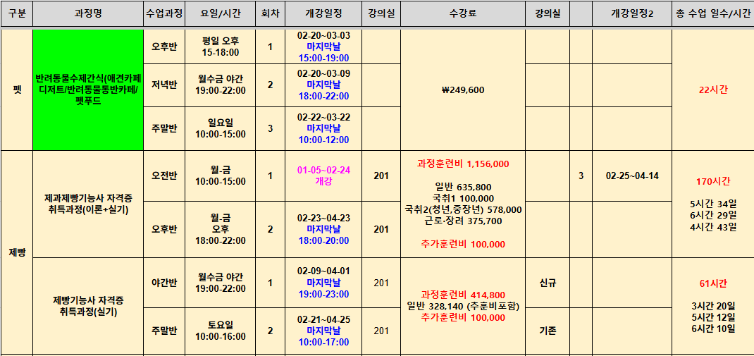 2. 인천 주안 인천커피제과제빵평생교육원 2월 과정 개강일정표