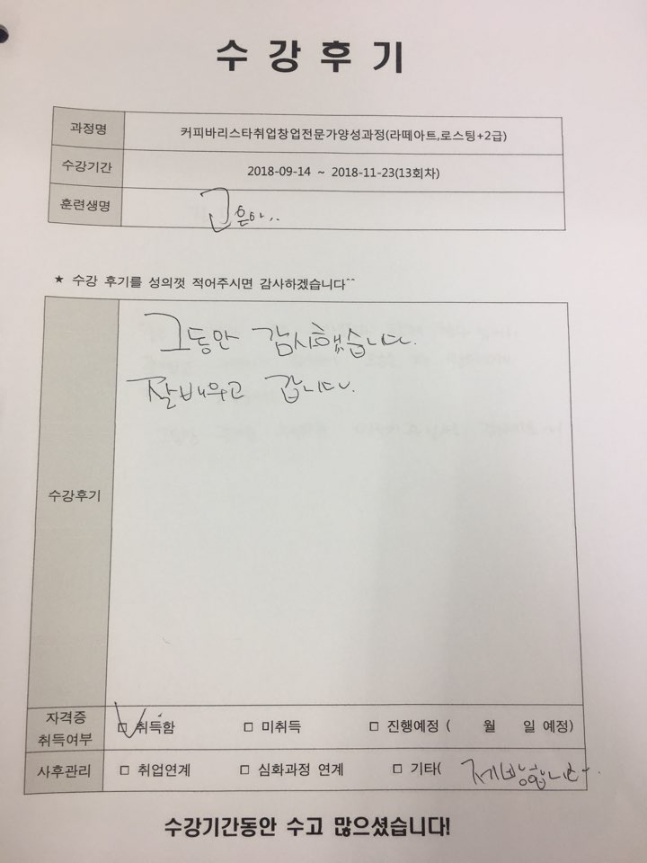커피바리스타취업창업 전문가양성과정(라떼아트,로스팅+2급) 2018-09-14~2018-11-23(13회차)