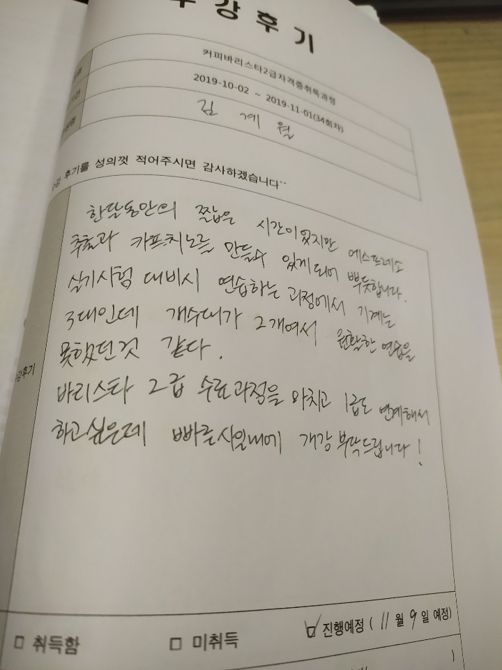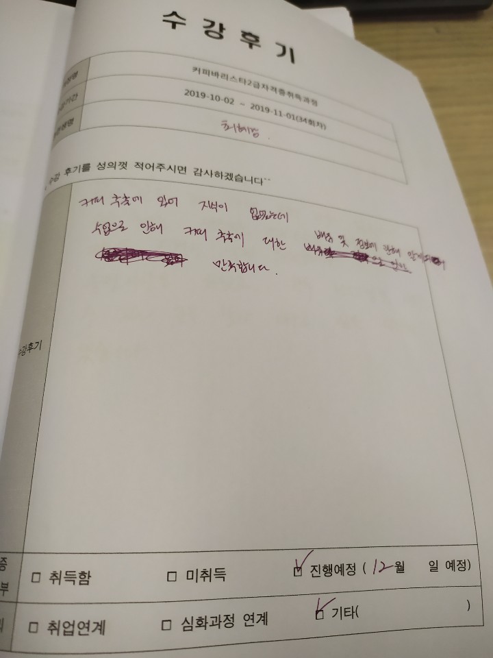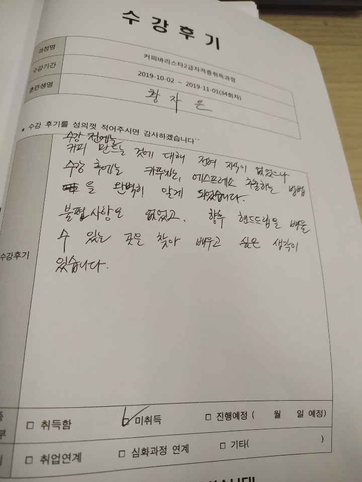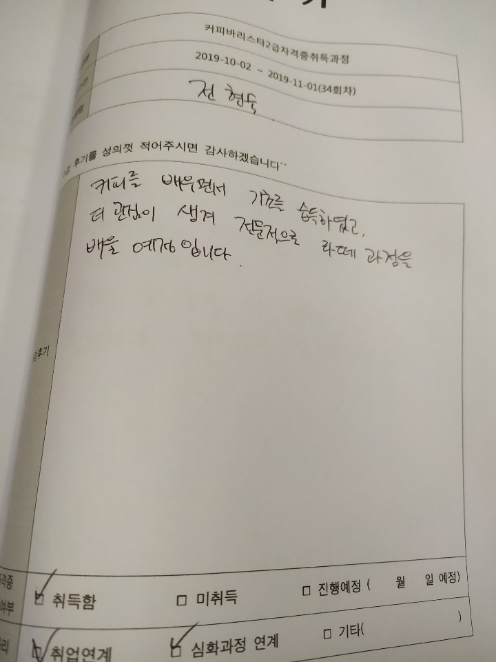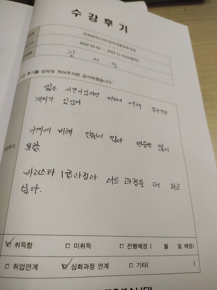 인천부평커피바리스타2급자격증취득과정 34회차 평일 월수금 야간