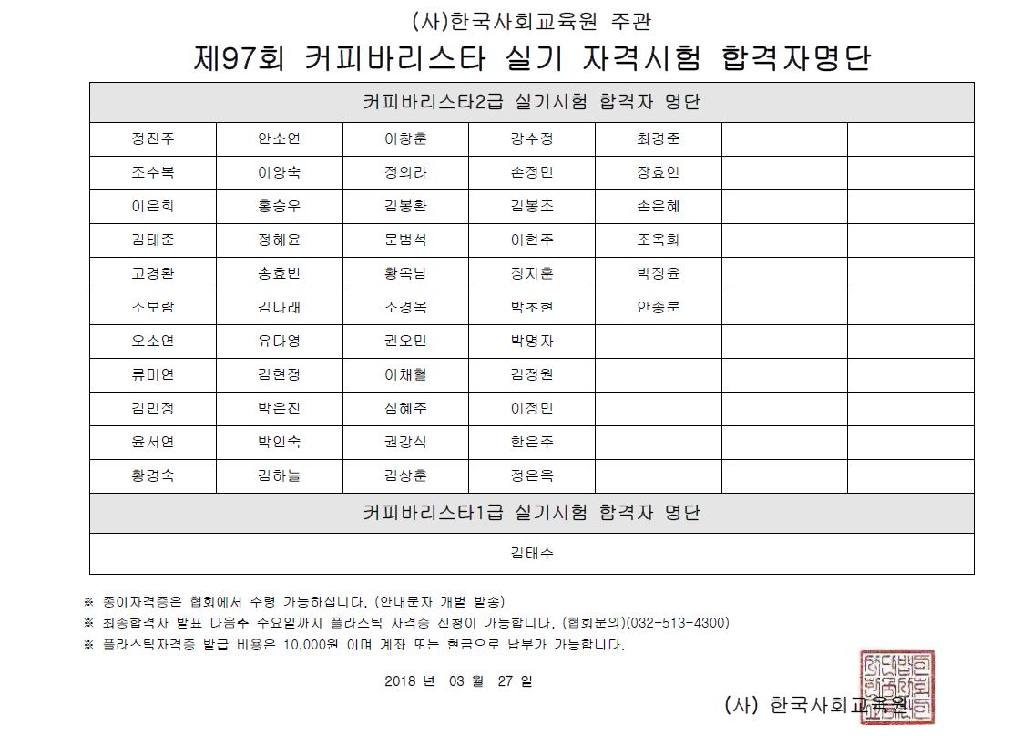 [97회] 커피바리스타 최종 합격자 발표