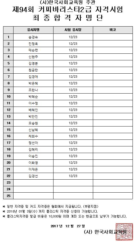 [94회] 커피바리스타 최종 합격자 발표