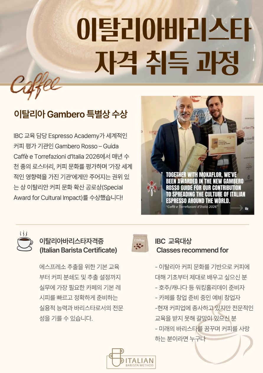 [공지]이탈리안 바리스타 자격증(IBC) 교육담당 Espresso Academy Cambero 특별상 수상