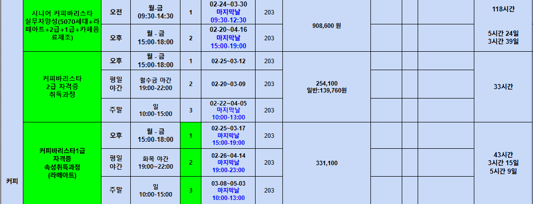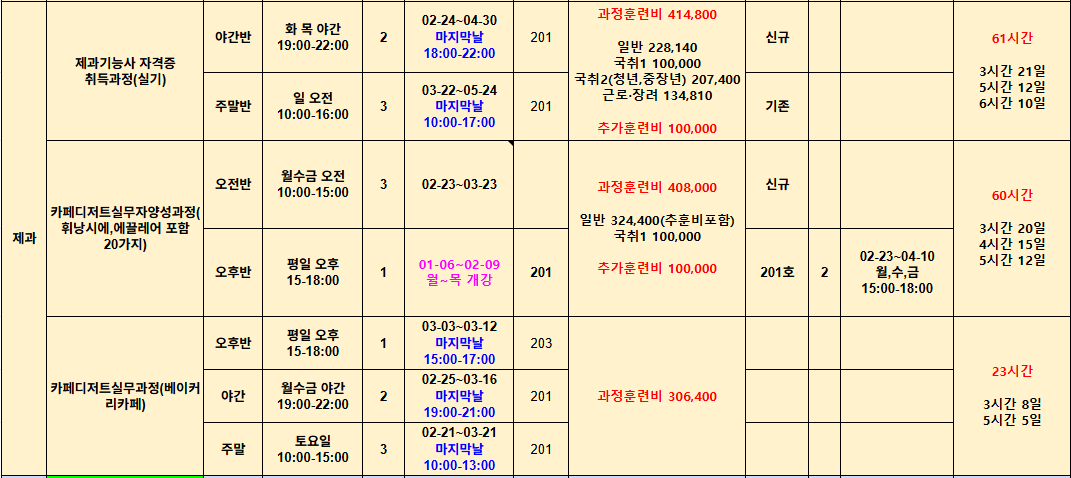 2. 인천 주안 인천커피제과제빵평생교육원 2월 과정 개강일정표