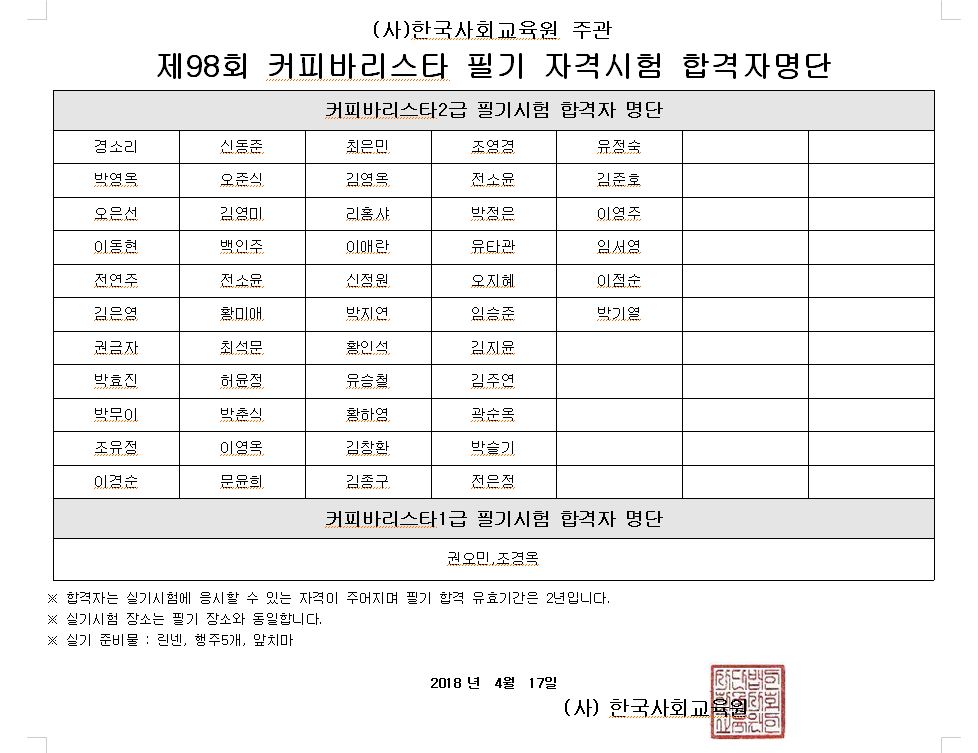 : [98회] 커피바리스타 최종 합격자 발표
